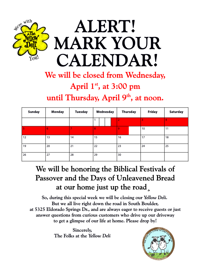 FESTIVAL CLOSURES We Close our doors during several special Biblical Festivals throughout the year. Here you will find current or upcoming deli Closures. As well as a little understanding why… Post navigation Previous post Our Own Fresh Green Yerba Mate’